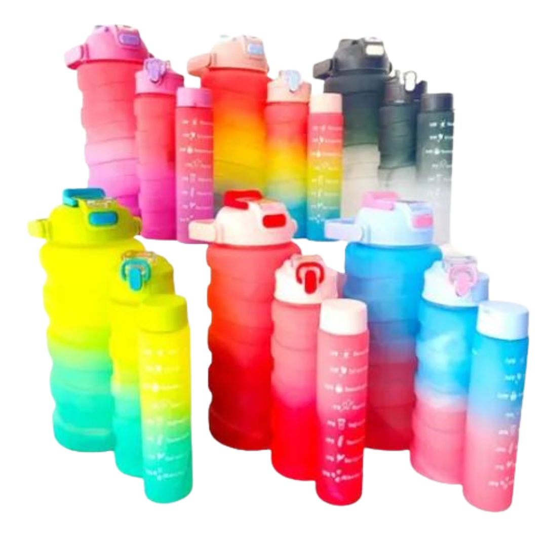 Chega de carregar várias garrafas! Com o Kit Garrafa 3 em 1, você tem a praticidade de 3 tamanhos diferentes em um único produto: